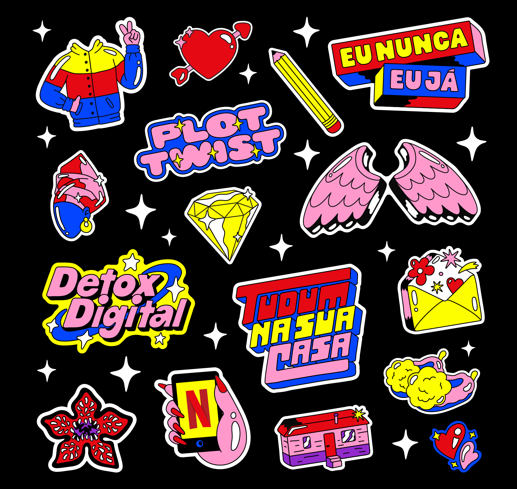 I was invited to make 100 stickers to compose the Tudum from Netflix. The project had two parts: The first was a 100-page almanac full of exclusive content, games and interviews with the talents of the Netflix series and films. The almanac was distributed to over 200k people for free and went viral for weeks! The second part of the project was Tudum LIVE presented by Maísa with the participation of Pabllo Vittar, Anitta, Emicida, Marília Mendonça and many others. A project created in 2020 as a freelancer. © Netflix Brasil Stickers: Leandro Assis + Paula Cruz + Camila Rosa Art Direction - Stickers: Tátil Creative Direction + Design: Porto Rocha Editorial Project + Content: Revista Trip 3D: Rafael Eifler + Rodrigo de Carvalho Illustrations - Almanaque Tudum: Giovanna Cianelli + Falenci + Butcher Billy
